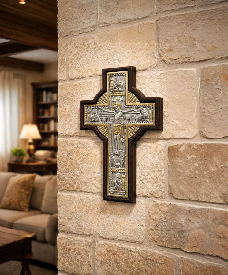 Ξύλινος σταυρός ευλογίας με ασημοεπίχρυση παράσταση.