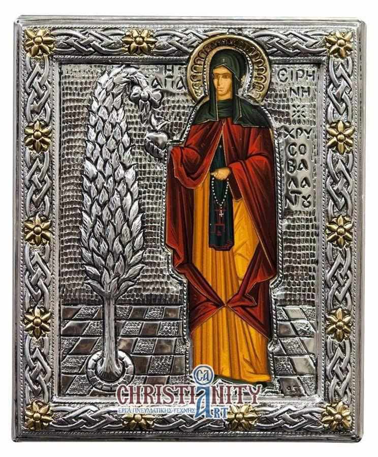 Εικόνα φιλοτεχνημένη σε καμβά πάνω σε ξύλο, με ασημένια επικάλυψη και τοπικά επιχρυσώματα. Η εικόνα συνοδεύεται από δωρεάν βάση στήριξης.