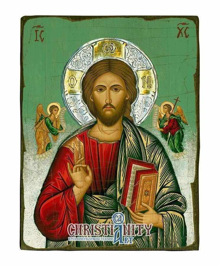 Εικόνα του 16ου αι. Όπως ορίζει η χριστιανική αγιογραφία, ο Παντοκράτωρ Ιησούς δεσπόζει στον κεντρικό θόλο όλων των βυζαντινών ναών, ενώ εάν ο ναός δεν έχει θόλο (τρούλο), τότε η εικόνα του Χριστού αγιογραφείται στο κέντρο της οροφής του ναού. Σε αυτή την εκδοχή της εικόνας, ο Ιησούς αγιογραφείται με βλέμμα αυστηρό αλλά με έκδηλη την αγάπη που τον χαρακτηρίζει, με χρυσό φωτοστέφανο, με το δεξί του χέρι να ευλογεί και με το αριστερό να κρατά κοντά στο στήθος του το Ευαγγέλιο. Το πρωτότυπο έργο, πηγή έμπνευσης του αγιογράφου, βρίσκεται στη Σίφνο, στον ιερό βράχο της Χρυσοπηγής, στο περίφημο μοναστήρι του 1650, την Ιερά Μονή Παναγίας Χρυσοπηγής.