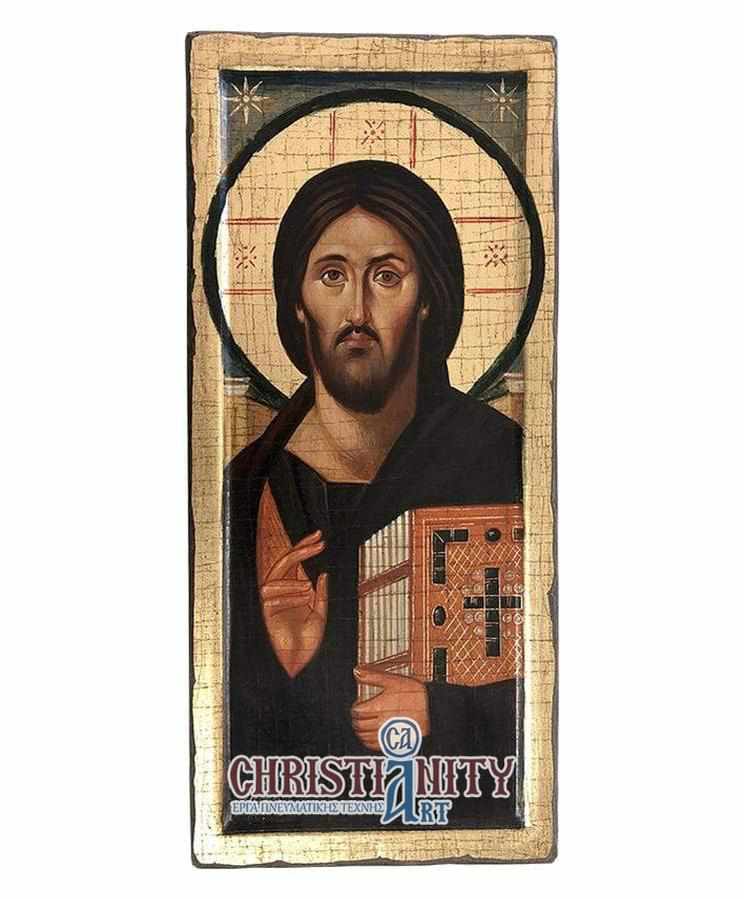 Μία από τις πιο εντυπωσιακές, ασκητικές απεικονίσεις της εικόνας του Χριστού είναι αυτή που φιλοτεχνήθηκε το πρώτο μισό του 6ου αιώνα και απεικονίζει τον Χριστό ως Παντοκράτορα, στη Μονή της Αικατερίνης του Σινά. Η εικόνα ως προς την τεχνική της αναφέρεται ως εγκαυστική, αφού χρησιμοποιήθηκε η ανάμιξη της χρωστικής ουσίας με κερί ή κερί και ρητίνη και η εφαρμογή της με πυρωμένο σίδερο ή άλλο μέσο. Στην εικόνα το πρόσωπο του Χριστού παρουσιάζει μία ανεπαίσθητη ασυμμετρία των ματιών, τα οποία εκφράζουν την άχρονη ύπαρξη Του παραπέμποντας στην τεχνική των Φαγιούμ, ενώ οι αποχρώσεις της σάρκας και το φως που εκπέμπει υπογραμμίζουν τη μη ανθρώπινη φύση του Χριστού. Το αντίγραφο της εικόνας του Χριστού Παντοκράτορα στη Μονή του Σινά φέρνει κοντά το πρόσωπο του Χριστού δίνοντας έμφαση στη λάμψη του δέρματος και στην έκφραση των ματιών.