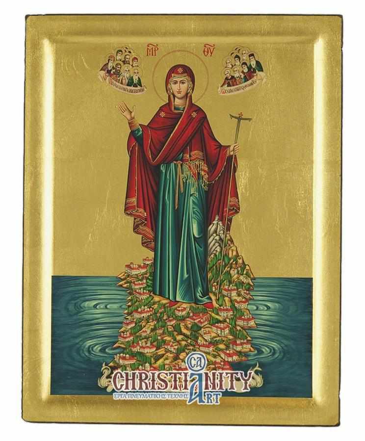 Η χριστιανική παράδοση θέλει τη μητέρα του Θεού να έχει επισκεφθεί το Άθως σε αρκετές περιπτώσεις, ενώ αναφορές γίνονται και για την επίσκεψή της στο Όρος μαζί με τον Άγιο Ιωάννη και άλλους, με βάρκα. Κατά τις επισκέψεις της η Παναγία έσωζε με τη δύναμη της πίστης Της πολλούς μοναχούς και προσκυνητές, μοναστήρια και όλο το βουνό από πολλές συμφορές. Η εικόνα της Παναγίας της Αθωνίτισσας, παρουσιάζει την Παναγία ως προστάτιδα όλου του βουνού, να φορά ένδυμα Ηγουμένης και να στέκεται πάνω από το βουνό Άθως. Η εικόνα εορτάζεται στις 28 Αυγούστου.