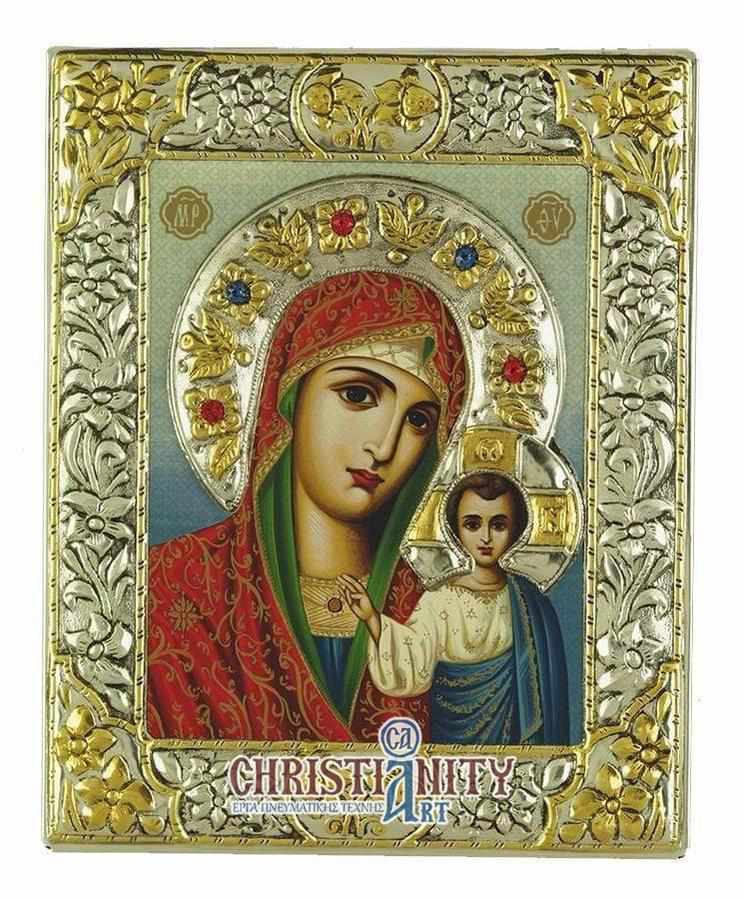 Εικόνα φιλοτεχνημένη σε καμβά πάνω σε ξύλο, με ασημένια επικάλυψη και τοπικά επιχρυσώματα. Η εικόνα συνοδεύεται από δωρεάν βάση στήριξης.