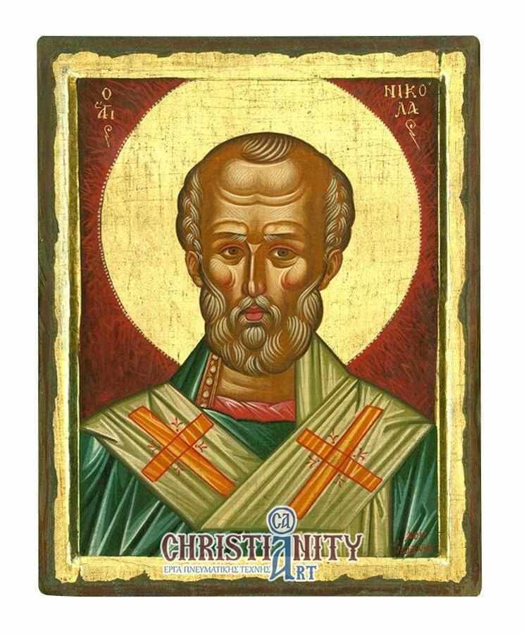 Ο Άγιος Νικόλαος ήταν ο μόνος γιος μίας πλούσιας, θρησκευόμενης οικογένειας στη Λυκία. Μετά το θάνατο των γονιών του μοίρασε όλη του την περιουσία στους φτωχούς. Έγινε γνωστός για το φιλανθρωπικό του έργο, παρά τις προσπάθειές του να το κρύψει. Κατά την ασκητική του ζωή η φωνή του Θεού τον διέταξε να ζήσει με τους ανθρώπους, γιατί μόνο έτσι θα δόξαζε το όνομά Του. Εκλέχθηκε αρχιεπίσκοπος Μύρων της Λυκίας, όπου υπηρέτησε το ποίμνιό του σαν αληθινός ποιμένας. Κατά τη διάρκεια της αυτοκρατορίας του Διοκλητιανού και του Μαξιμιλιανού, δίδαξε στους ανθρώπους τη δύναμη του Κυρίου. Έσωσε τρεις ανθρώπους από το θάνατο, δύο φορές. Ευγενικός, ειλικρινής, δίκαιος υπήρξε πραγματικός Άγγελος για τους ανθρώπους. Άφησε τα εγκόσμια το 343 μ.Χ. στις 6 Δεκεμβρίου. Το πρωτότυπο της εικόνας του 15ου αι. βρίσκεται στην Ιερά Μονή Γωνιάς, Κίσσαμου Κρήτης.