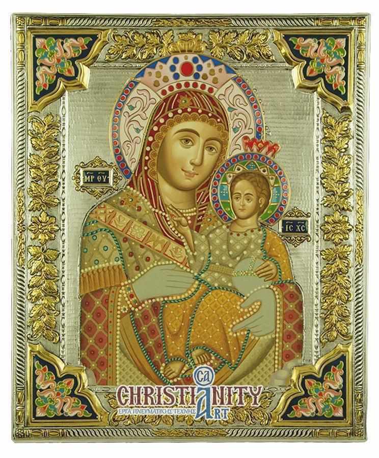 Εικόνα σε καμβά πάνω σε ξύλο. Η εικόνα είναι επικαλυμμένη με καθαρό ασήμι και τοπικά επιχρυσώματα. Έχει διακοσμηθεί με σμάλτo.
