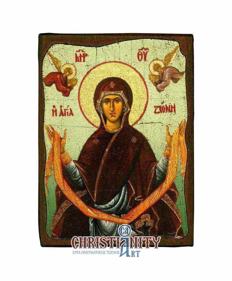 Παναγία Αγία Ζώνη - Ξύλινη παλαιωμένη εικόνα σε καμβά με χρυσό φόντο - Άγιο Όρος