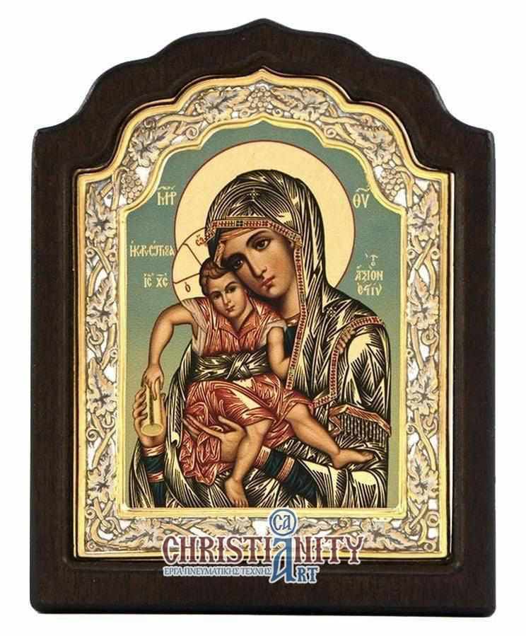 Η κορνίζα που περιβάλλει την εικόνα είναι από ασήμι, με επίχρυσες λεπτομέρειες που αναδεικνύουν τη λάμψη και την κομψότητά της.