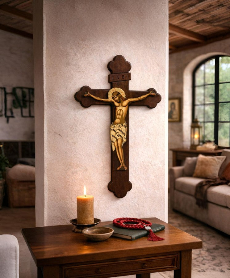 Ο σταυρός συνδυάζει τη βυζαντινή τεχνοτροπία με τη θεολογική δύναμη του συμβολισμού, εκφράζοντας τη θυσία, τη λύτρωση και την αιώνια αγάπη του Χριστού για τον άνθρωπο. Η ξύλινη βάση αναδεικνύει το χρυσό φως του σώματος του Χριστού, δημιουργώντας μια αισθητικά ισορροπημένη και πνευματικά βαθιά εικόνα.