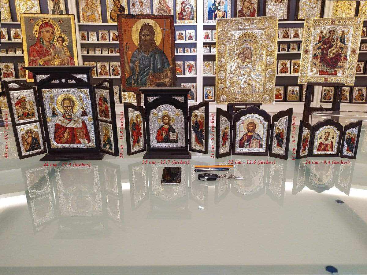 Τρίπτυχο εικόνων φιλοτεχνημένες σε καμβά πάνω σε ξύλο, επικαλυμμένες με καθαρό ασήμι και τοπικά επιχρυσώματα.