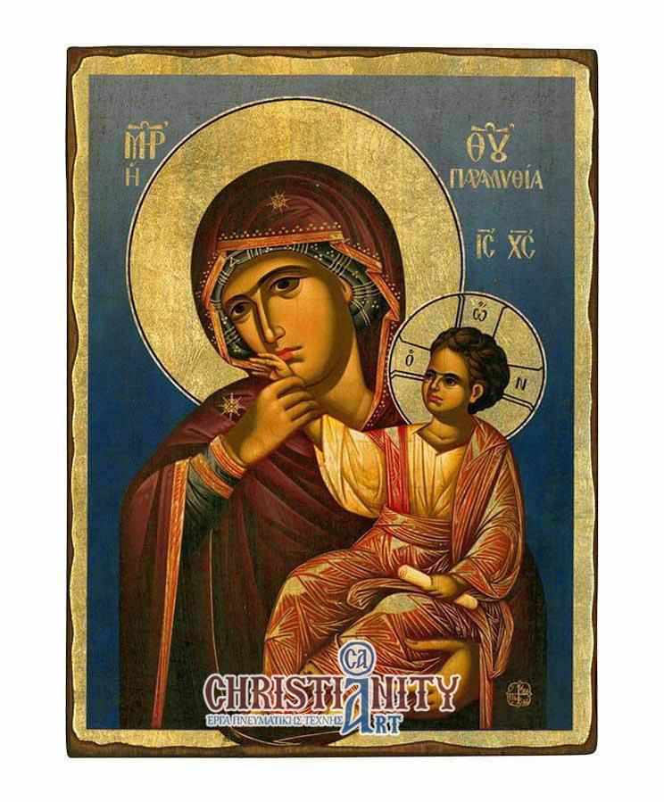 Η ονομασία Παραμυθία, δηλαδή παρηγοριά, δόθηκε σ’ αυτή τη μορφή της Παναγίας όπου η θέασή της γαληνεύει και παρηγορεί την ψυχή. Σύμφωνα με τη χριστιανική παράδοση η Παναγίας της Παραμυθίας στην Ιερά Μονή Βατοπαιδίου διασώθηκε χάρη στη θαυματουργή παρέμβαση της συγκεκριμένης εικόνας της Παναγίας, όταν απειλήθηκε από πειρατές στις αρχές του 14ου αι. Η εικόνα της Παναγίας φυλάσσεται στο παρεκκλήσι του Ναού όπου οι Μοναχοί κρατούν άσβηστο καντήλι και ψάλλουν παράκληση καθημερινά.