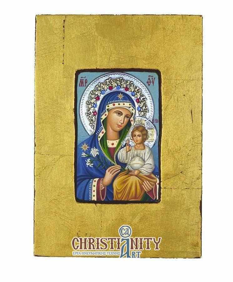 Παλαιωμένη εικόνα φιλοτεχνημένη σε καμβά επάνω σε προσεκτικά επεξεργασμένο ξύλο, αποπνέοντας μια αίσθηση παράδοσης και πνευματικότητας. Η εικόνα πλαισιώνεται από ξύλινη κορνίζα διακοσμημένη με φύλλο χρυσού, το οποίο έχει υποστεί τεχνητή παλαίωση, χαρίζοντας μια αυθεντική και διαχρονική αισθητική. Το φωτοστέφανο της μορφής είναι κατασκευασμένο από ασήμι, διανθισμένο με τοπικά επιχρυσώματα αναδεικνύοντας την υψηλή δεξιοτεχνία και τον λεπτομερή σχεδιασμό. Η εικόνα είναι διακοσμημένη και με πολύχρωμες πέτρες. Η εικόνα συνοδεύεται από δωρεάν βάση στήριξης, προσφέροντας ευκολία στην τοποθέτηση και σταθερότητα. Ένα έργο τέχνης που συνδυάζει την παράδοση με την ποιότητα, ιδανικό για κάθε χώρο και ως δώρο με πνευματική αξία.